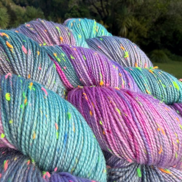 85% SW merino 15% Neon Donegal neps (the neps glow in the dark under UV light)