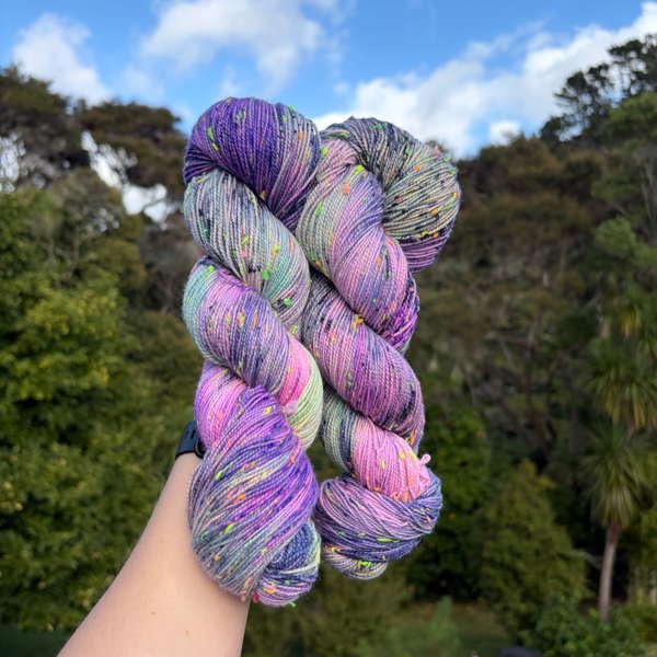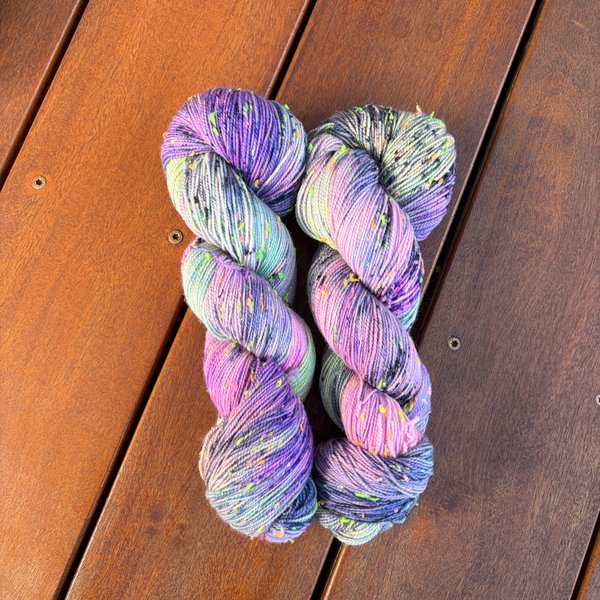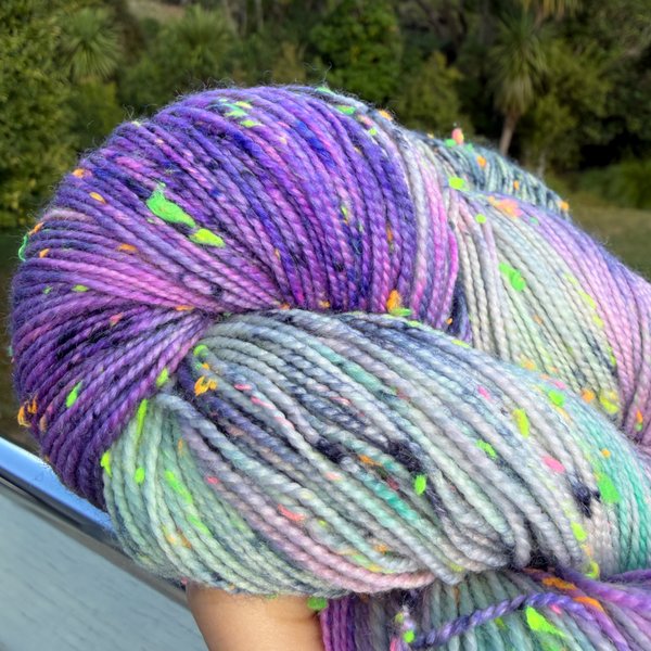 85% SW merino 15% Neon Donegal neps (the neps glow in the dark under UV light)