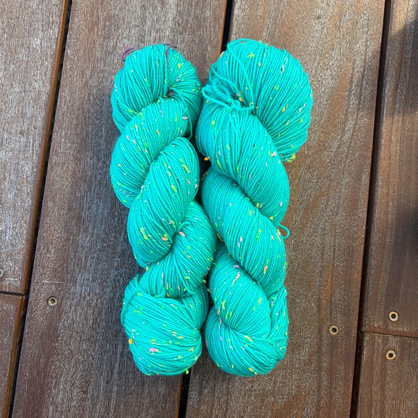 85% SW merino 15% Neon Donegal neps (the neps glow in the dark under UV light)