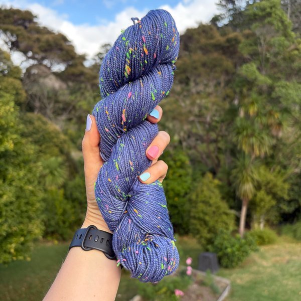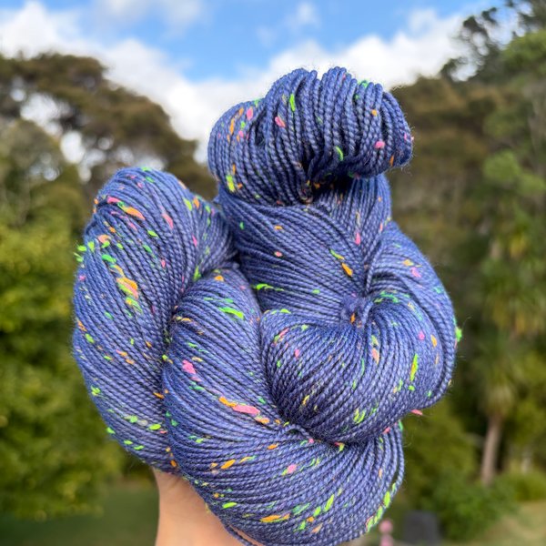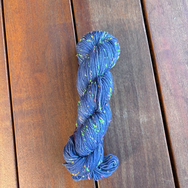 85% SW merino 15% Neon Donegal neps (the neps glow in the dark under UV light)