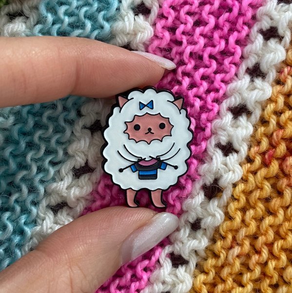 Metal pin in shape of a white ship knitting a tiny sweater